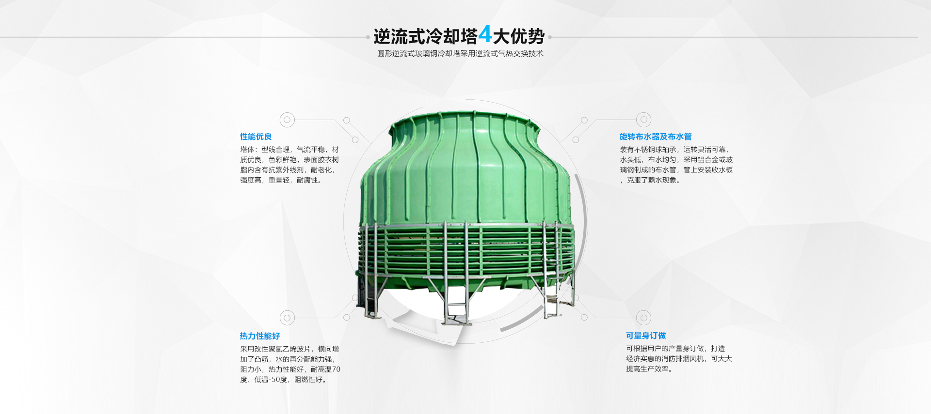 圓形冷卻塔-圓形逆流式閉式冷卻塔里面填料是PVC淋水片,以擴(kuò)散淋水面積,利用旋轉(zhuǎn)布水形式,實(shí)現(xiàn)布水均勻,以加強(qiáng)到冷卻的效果,···